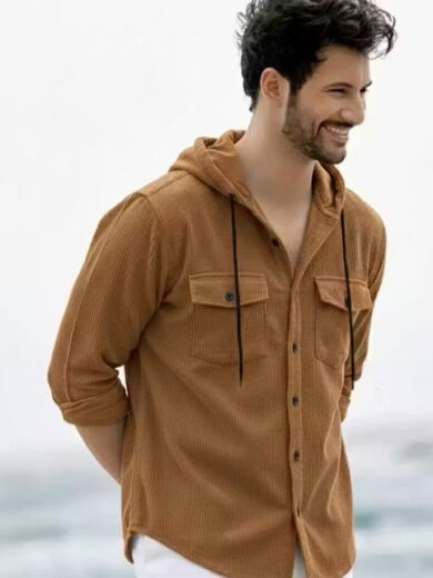 Men’s Premium Black Corduroy Hooded Shirt Jacket | Full Sleeve Button-Down Shacket with Chest Pockets | Stylish Casual & Winter Wear for Men