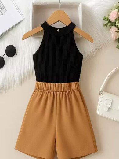 Stylish sleeveless black top paired with a light beige skirt perfect for a summer outing or casual brunch