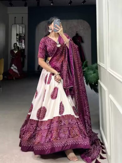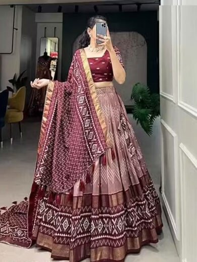 Women's Tussar Silk Fabric With Bandhni & Patola Print And Foil Work Lehenga Choli For Womens And Girls