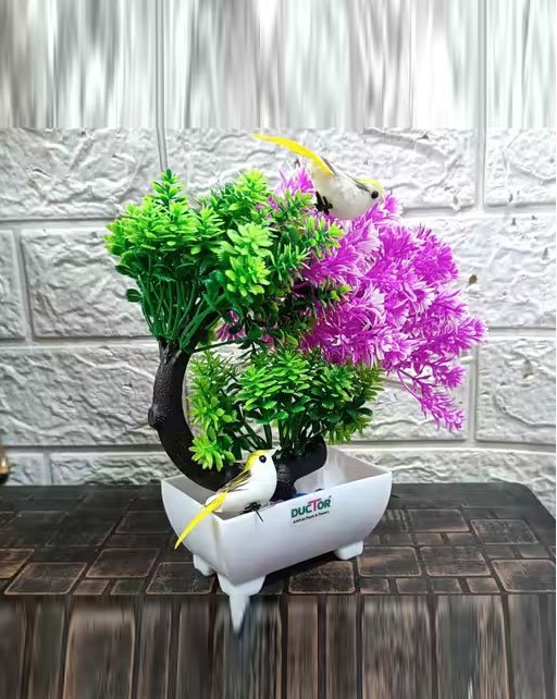 Name: Artificial Bonsai Plant Green & Pink Tree with White Pot