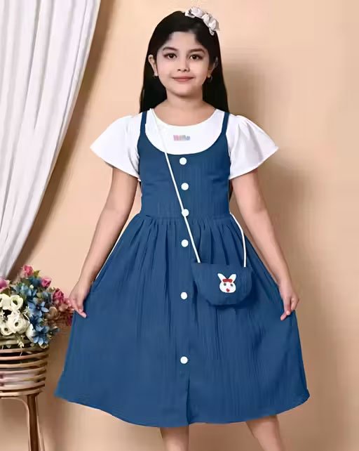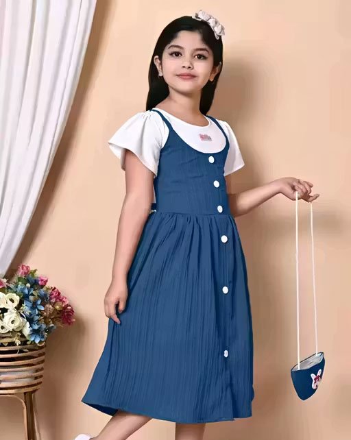 Name: Girls frock | Pinafore Style Over a Short-Sleeved Top, Midi, Short Sleeve, Round, A-Line,
