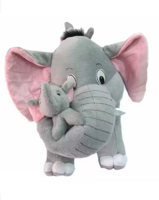 nursery or playroom. The mother elephant is made from soft and cuddly plush material, and her two