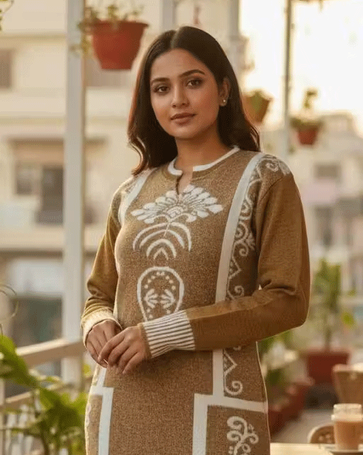 Stay cozy and stylish this winter with our elegant 1-piece wool blend kurti crafted from soft and warm fabric ideal for cold weather. The beautifully Jacquard kurta features a flattering 45–46 inch straight fit with full sleeves, a stylish Mandarin V-neck, and One practical side pockets for added convenience. this ethnic outfit offers comforts and sophistication, making it perfect for casual outings, festive gatherings, parties, and all your winter events.