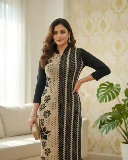 Stay warm and stylish this winter with this elegant woolen kurta in a rich brown and black combination. Featuring a striking blend of floral motifs and chevron woven patterns, this straight-fit kurta is designed for both comfort and sophistication. The full sleeves with a contrast black design add a chic touch, while the side slits ensure ease of movement. Perfect for office wear, casual outings, or festive gatherings during chilly days.