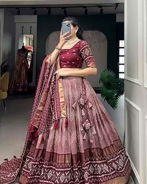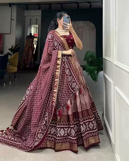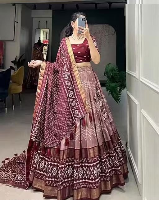 Women’s Tussar Silk Fabric With Bandhni & Patola Print And Foil Work Lehenga Choli For Womens And Girls